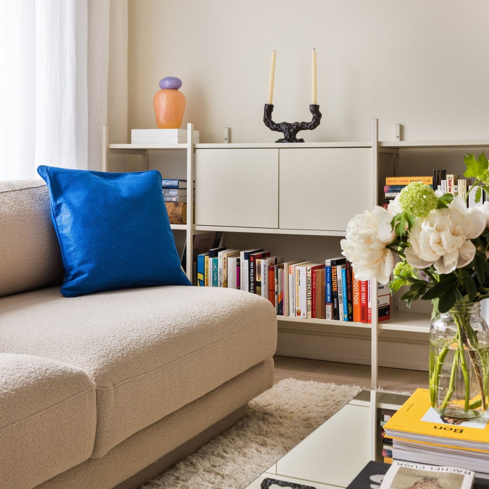 Kleines Bücherregal oder Sideboard in Off-White passt in jeden Raum Ihres Zuhauses. Die niedrige Höhe eignet sich perfekt für eine Lampe, ein Stillleben oder einen Stapel Kunstbücher. Dieses Regal ist 158 cm breit.