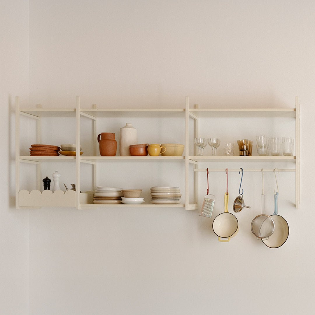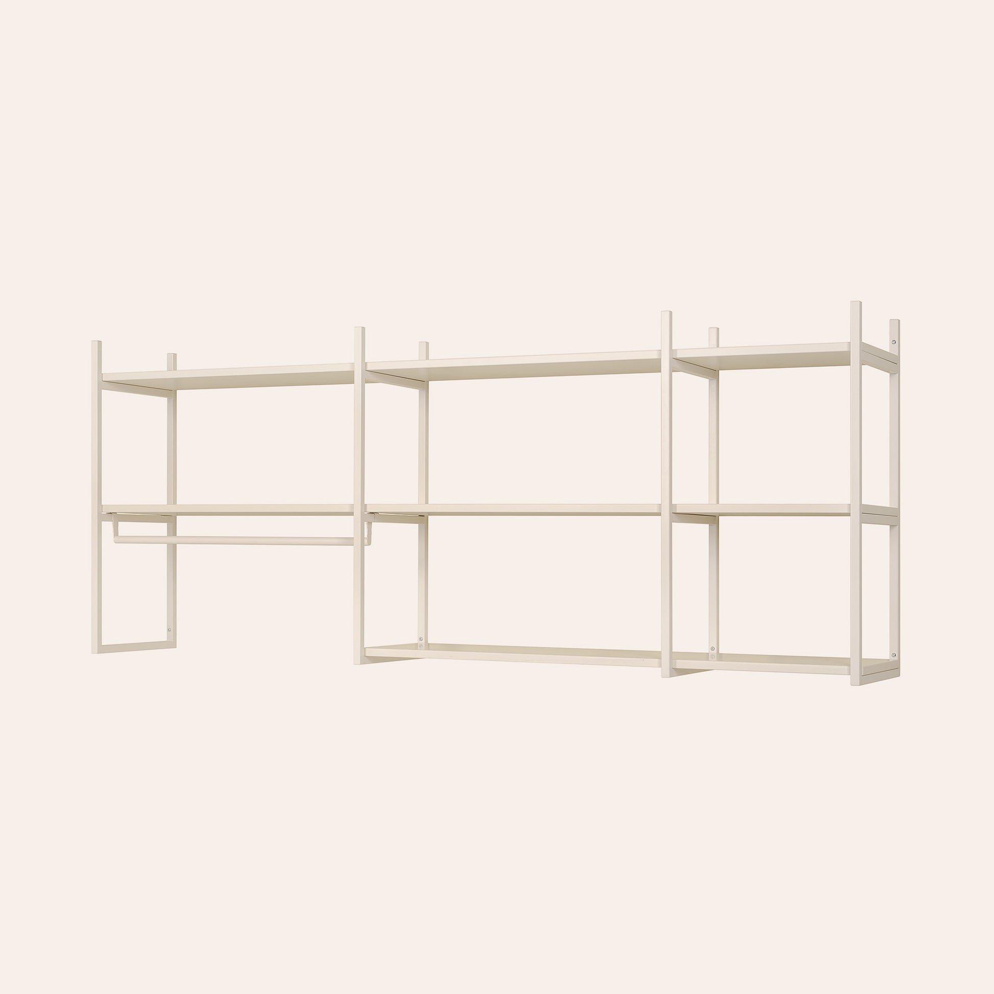 Wandhängendes offenes Regal in der Farbe Off-White, perfekt für Küche, Wohnzimmer oder Kinderzimmer. Ergänzen Sie es mit einer Kleiderstange, um alles von Küchenutensilien bis hin zu Kleidung aufzuhängen, eine spielerische Lösung für praktische Aufbewahrung. Diese Kombination ist 201 cm breit.