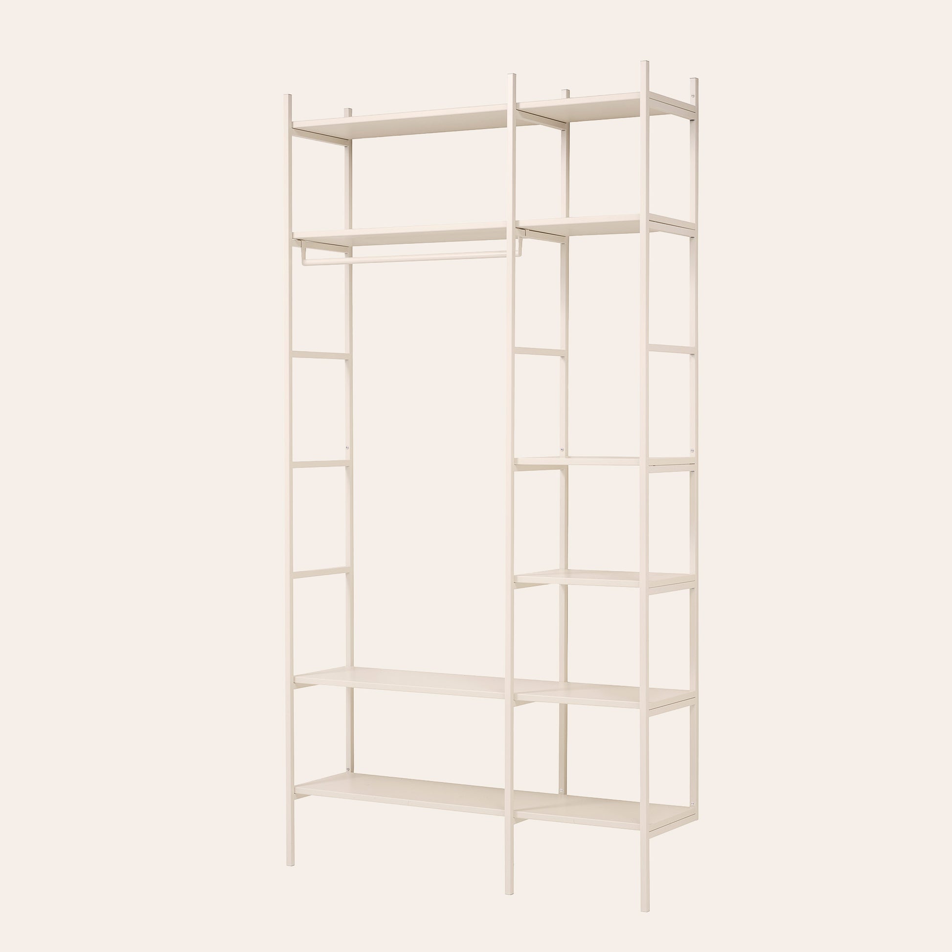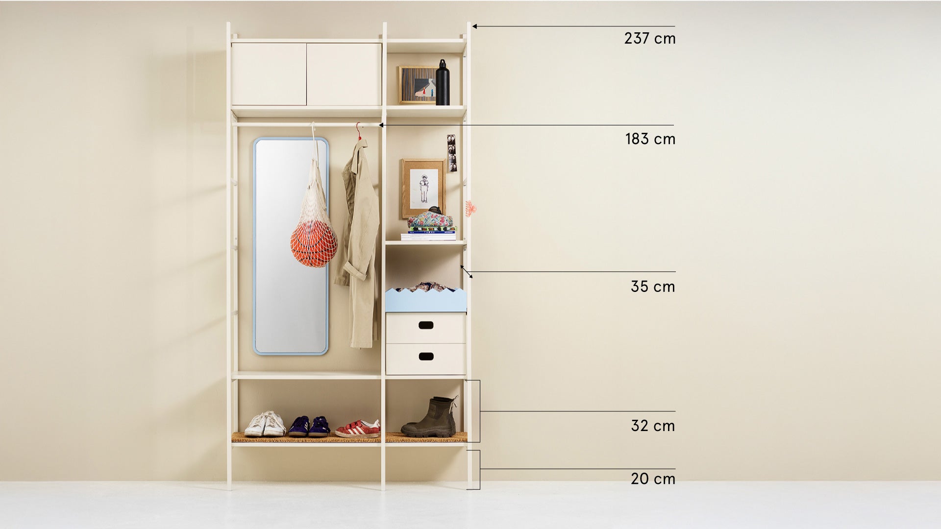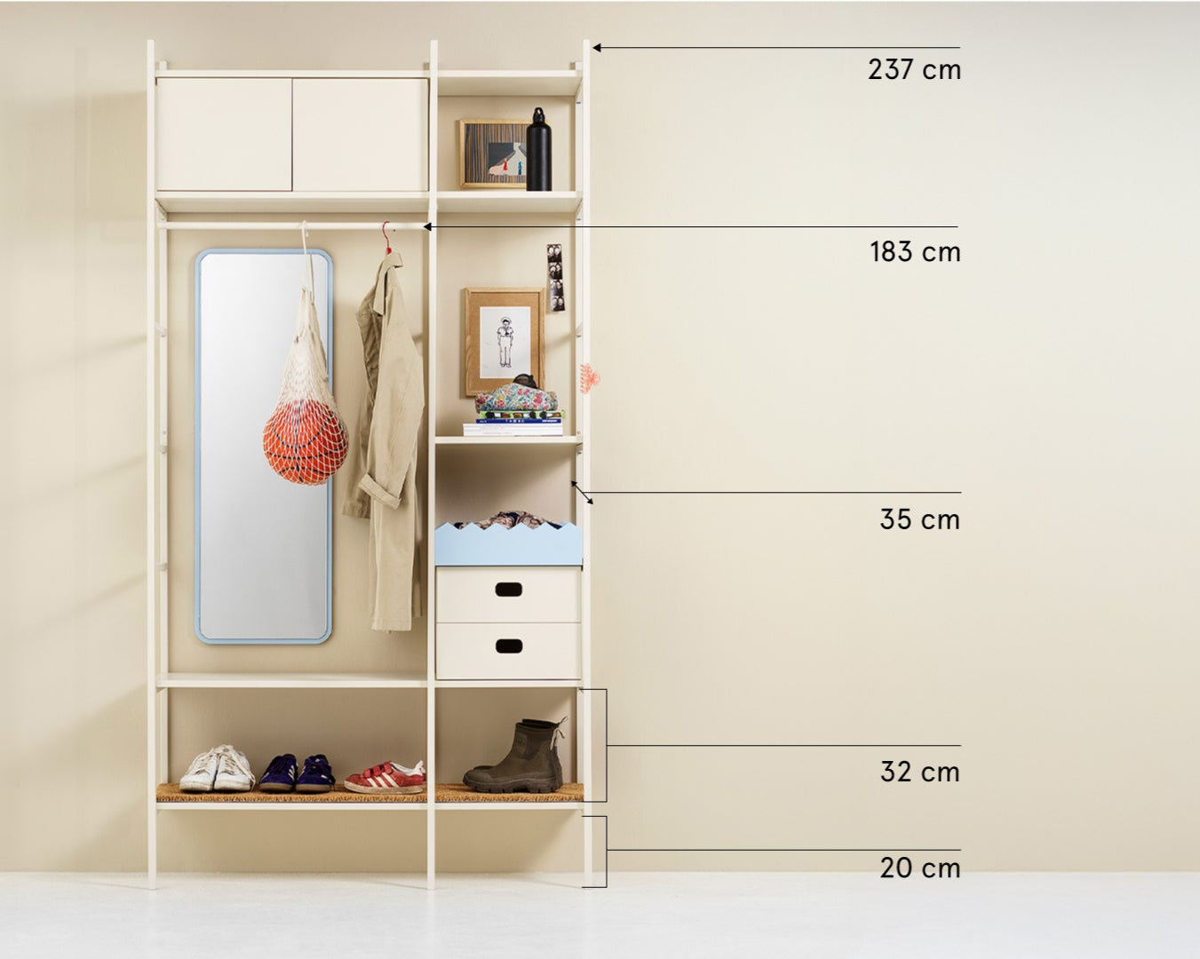 A stylish hallway shelf in off-white for order and elegance in your entrance. With a clothing rack for hooks and hangers, shelves for shoes, and space for everything else that needs a home in your hallway. Practical, airy and beautiful. This combination is 123 cm wide.