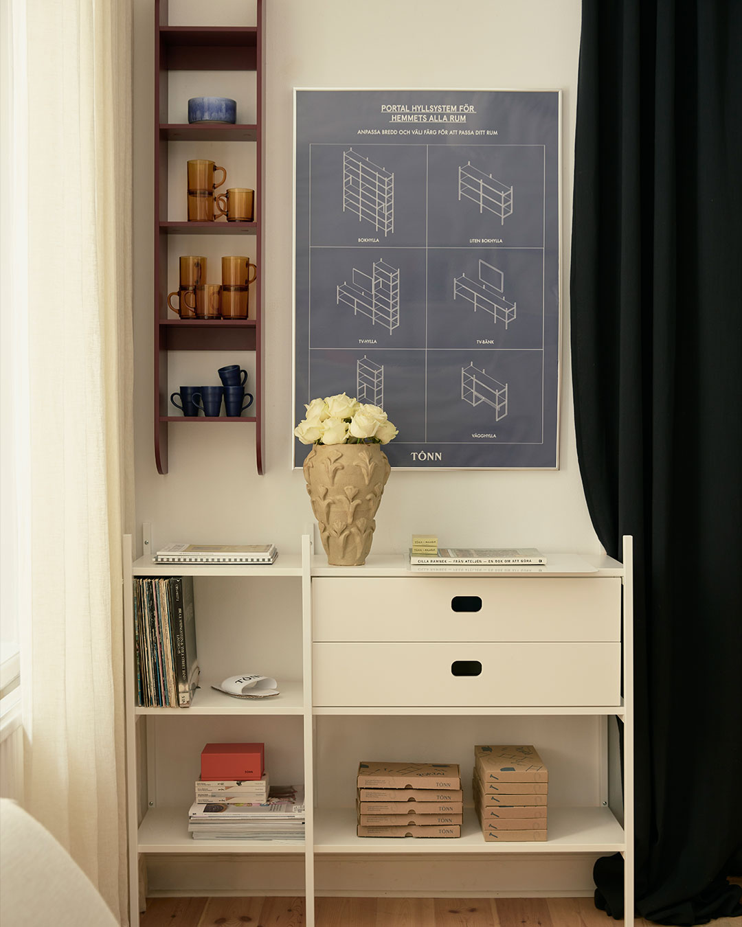 I den nya stylingens av Ida Lauga finns en Portalhylla i off-white med öppning för TV. En kombination som ofta efterfrågas, en hylla som får en TV att kännas som en naturlig del i inredningen. Soffan kommer från Meli Meli, mattan är från Layered och på hyllan hittar du keramik av Fanny Schultz. Bilderna är fotade av Fanny Rådvik.
