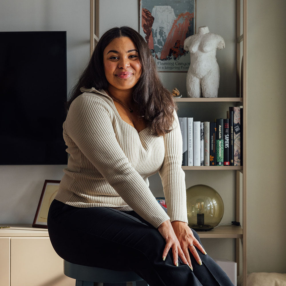 En lugn kamelfärgad och L-formad mediamöbel smälter fint in hemma hos Fanna Ndow Norrby. Skåpen sväljer laptops, sladdar och pärmar. Sånt som är fult i en mediamöbel. I boxarna ligger kvittoredovisningen.
