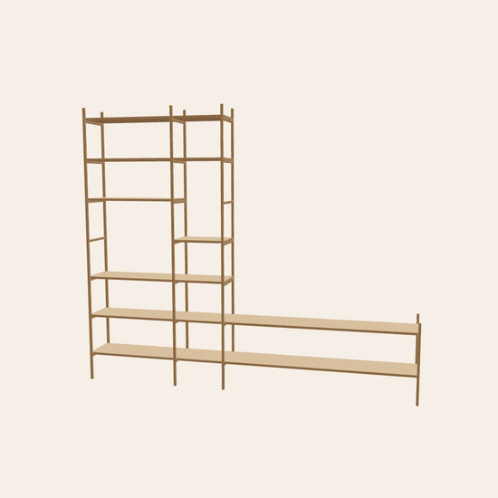 TV-hylla i färgen kamel – stilren förvaring och TV-lösning i ett. Den låga delen rymmer din TV på ett diskret sätt, medan den höga delen ger gott om plats för böcker och personliga föremål. Tillsammans bildar de en enhetlig lösning som samlar allt på ett ställe. Denna kombination är 281 cm bred.