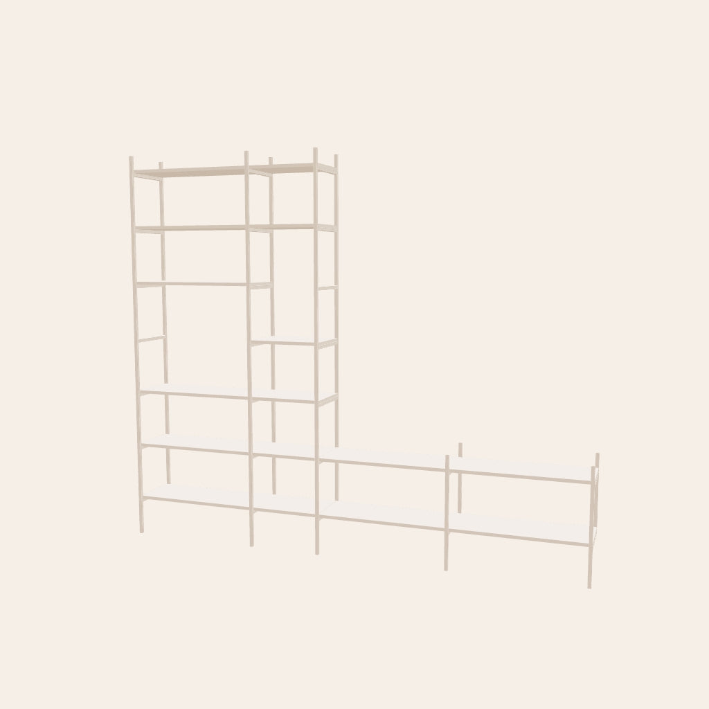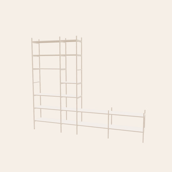 TV-hylla i färgen off-white – stilren förvaring och TV-lösning i ett. Den låga delen rymmer din TV på ett diskret sätt, medan den höga delen ger gott om plats för böcker och personliga föremål. Tillsammans bildar de en enhetlig lösning som samlar allt på ett ställe. Denna kombination är 279 cm bred.
