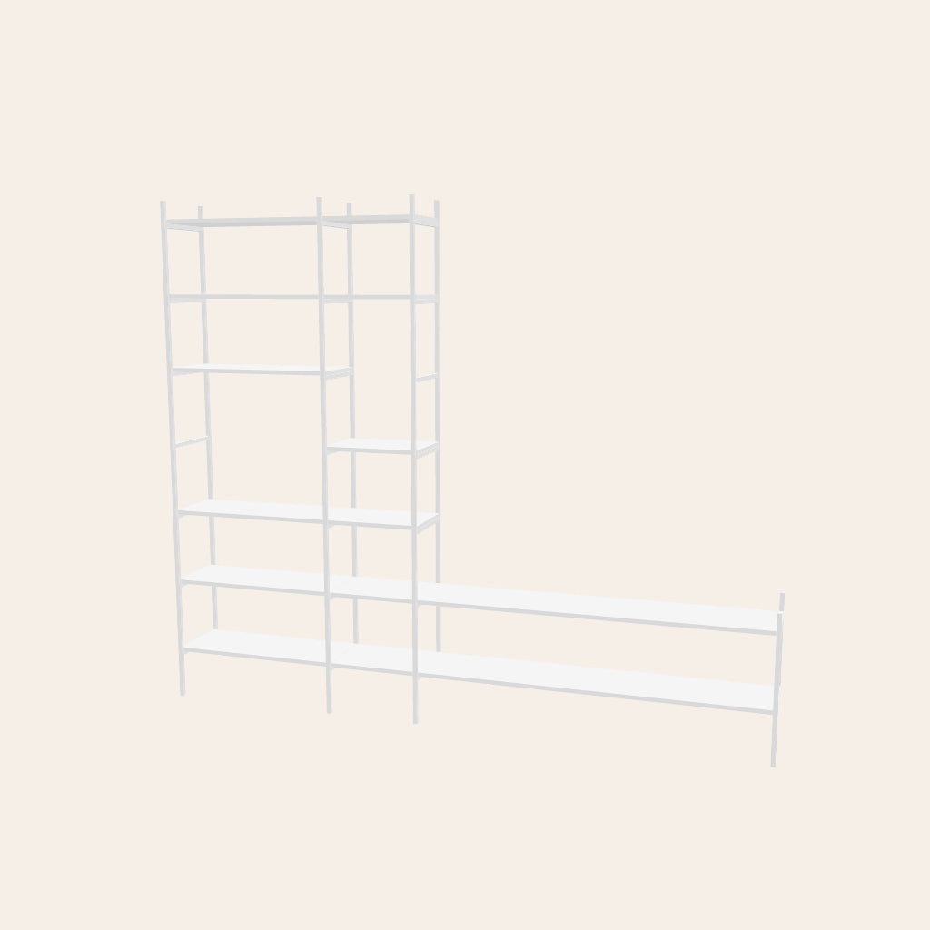 TV-hylla i färgen vit – stilren förvaring och TV-lösning i ett. Den låga delen rymmer din TV på ett diskret sätt, medan den höga delen ger gott om plats för böcker och personliga föremål. Tillsammans bildar de en enhetlig lösning som samlar allt på ett ställe. Denna kombination är 281 cm bred.