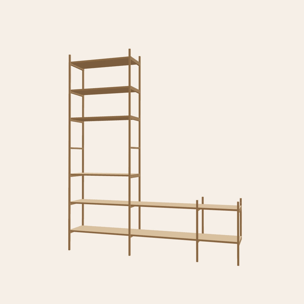 TV-hylla i färgen kamel – stilren förvaring och TV-lösning i ett. Den låga delen rymmer din TV på ett diskret sätt, medan den höga delen ger gott om plats för böcker och personliga föremål. Tillsammans bildar de en enhetlig lösning som samlar allt på ett ställe. Denna kombination är 201 cm bred.